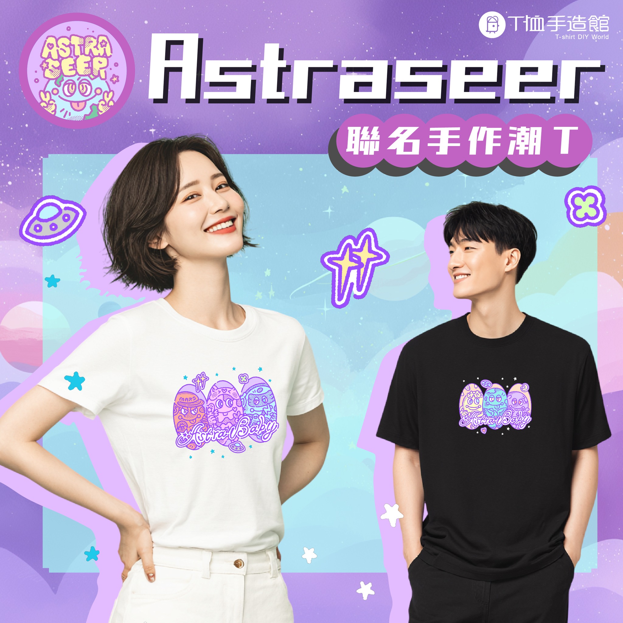 ★ 挑選喜歡的行星偶像圖 ★ 拼貼出喜歡的圖案位置 ★ 熱壓10秒完成,應援潮T帶回家! 一起把星球偶像穿上身, 用創意留住這場宇宙回憶!